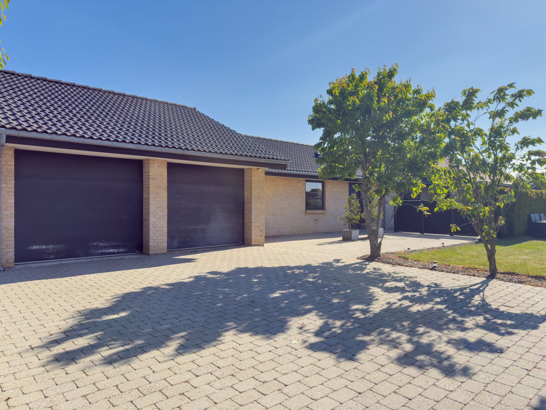 Haven er nem at holde med stor græsplæne og omkransende hæk, der giver god afskærmning. Foran huset er der en stor, flisebelagt indkørsel med god plads til parkering.